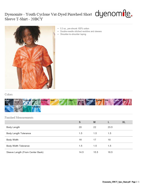 5.3 oz., pre-shrunk 100% cotton Double-needle stitched neckline and sleeves Shoulder-to-shoulder taping